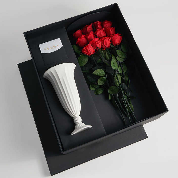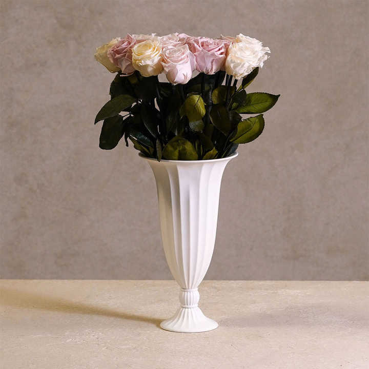 أكثر أنواع الزهور المنزلية شيوعًا في عام 2025، وهي زهور الورد المحفوظة مع ساق في مزهرية