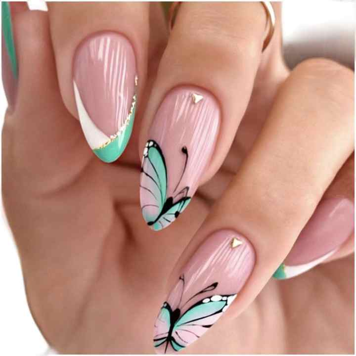 أظافر صناعية طويلة بتصميم على شكل فراشات مرصعة بأحجار الراين مع غراء فاخر للضغط على الأظافر القصيرة للعروس،