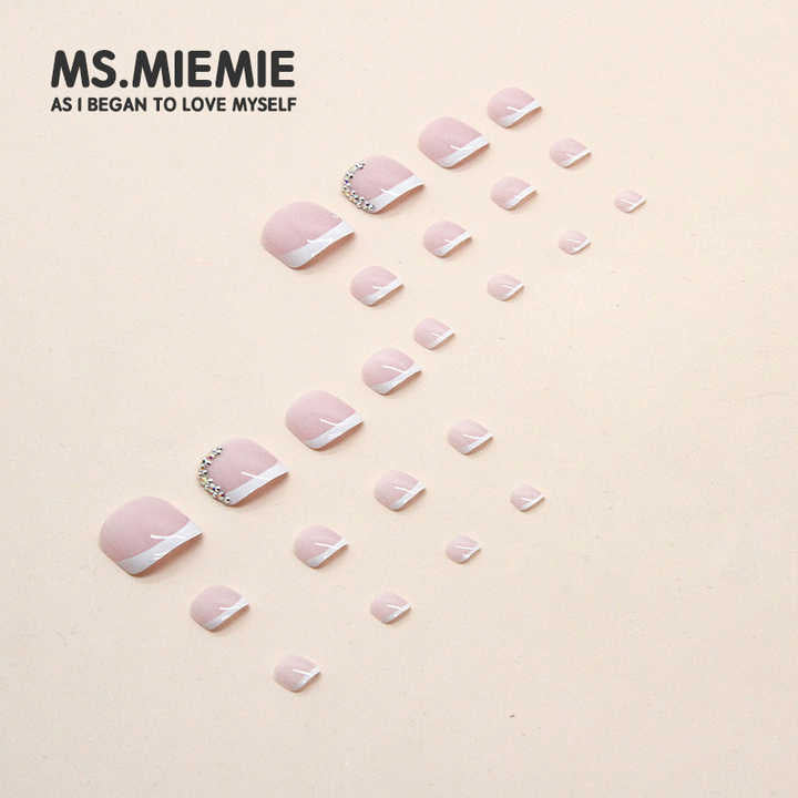 Ms.Miemie 24 ABS أظافر طرف اصبع القدم الفرنسية بلون واحد حجر الراين مزينة أظافر اصطناعية تصميم نمط صالون بالجملة