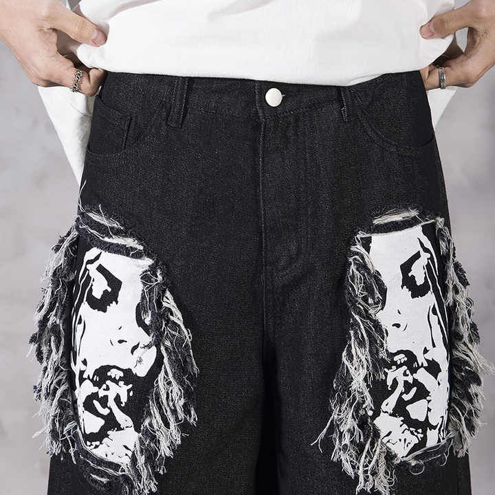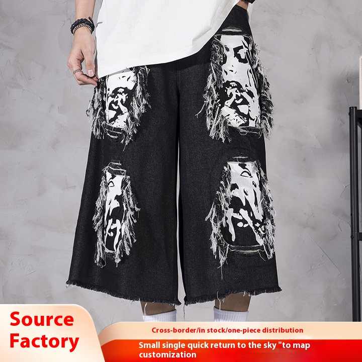 بنطلون جينز رجالي بطبعة رقمية على شكل جمجمة من Cyberpunk، بنطلون جينز واسع الساق يصل إلى الكاحل، مقاس كبير، جينز مستقيم الساق