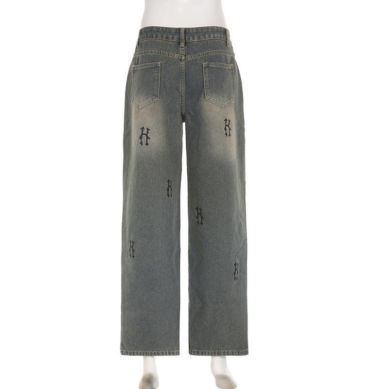 بنطلون جينز نسائي عتيق مطرز بساق واسعة ، ملابس الشارع الشهير ، سروال جينز منخفض الارتفاع للحبيب للسيدات ، بنطلون جينز فضفاض للنساء