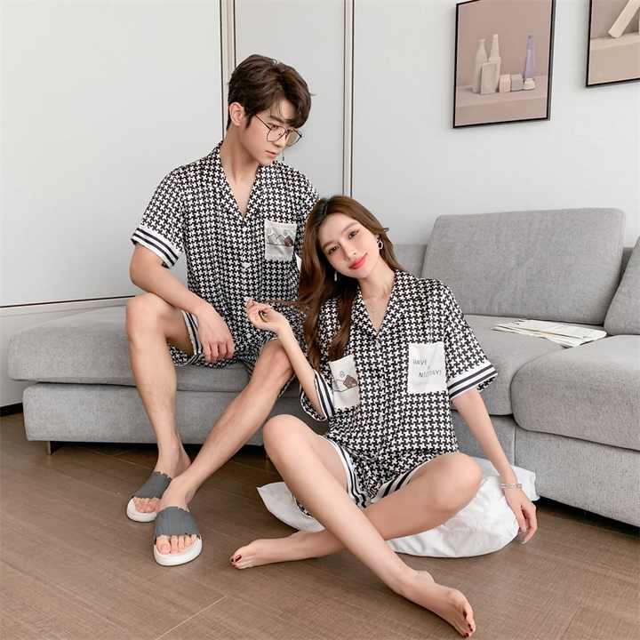 بيجامات زوجين نسائية من الحرير الجليدي بأكمام قصيرة مطبوعة بنقشة مربعات ألف طائر للرجال من الحرير مقاس كبير ملابس منزلية غير رسمية ثوب نوم برسومات كرتونية