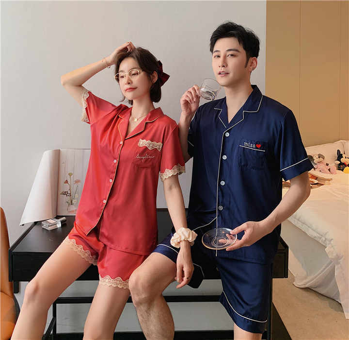 طقم بيجامات رجالي صيفي من الساتان بأكمام قصيرة وياقة دائرية ومقاس كبير للنساء من الحرير ملابس