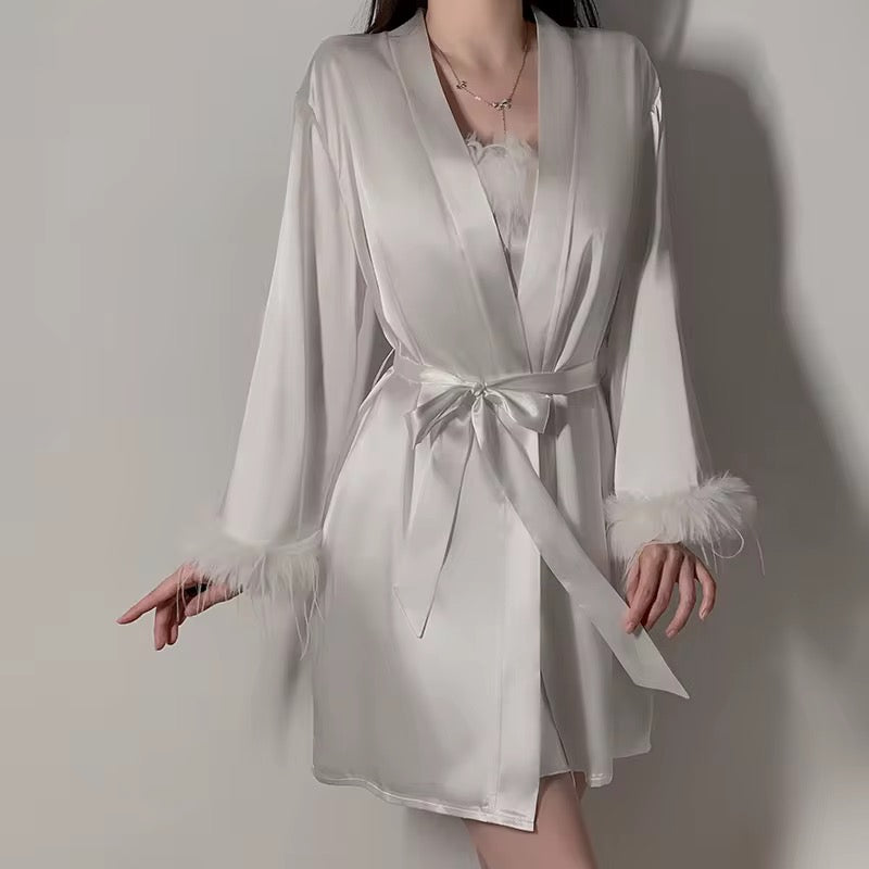 ملابس النوم الرسن النساء ثوب النوم الريش الساتان الساخن الفتيات منامة مجموعات رداء مثير ملابس النوم أفخم منامة Sleepwear Women Nightgown Feather Satin Hot Girls Pajamas Sets Robe Sexy Sleepwear Plush Pajamas