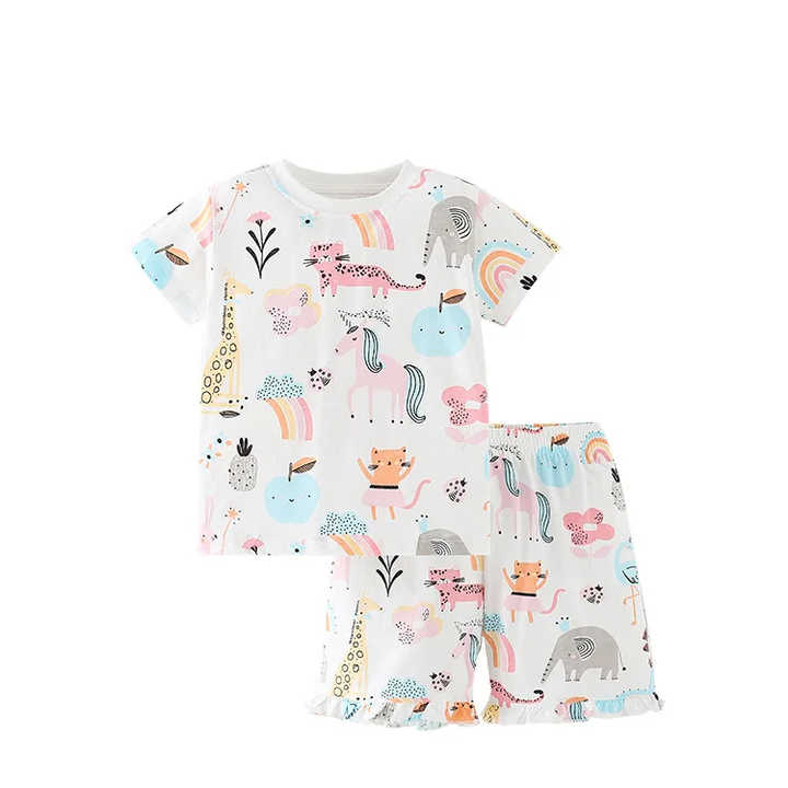 طقم بيجامات أطفال مطبوع بأكمام قصيرة من القطن للأولاد والبنات   مكون من قطعتين