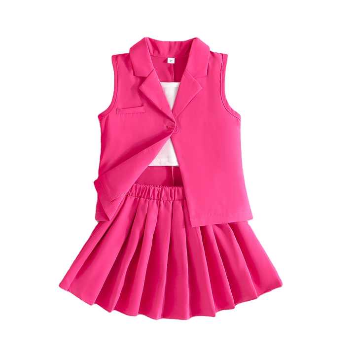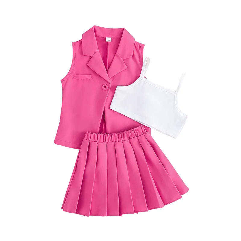 طقم ملابس للبنات من عمر 4 إلى 7 سنوات، مكون من بلوزة بدون أكمام وقميص قصير مع سترة وتنورة كورية أنيقة، ملابس للفتيات المراهقات