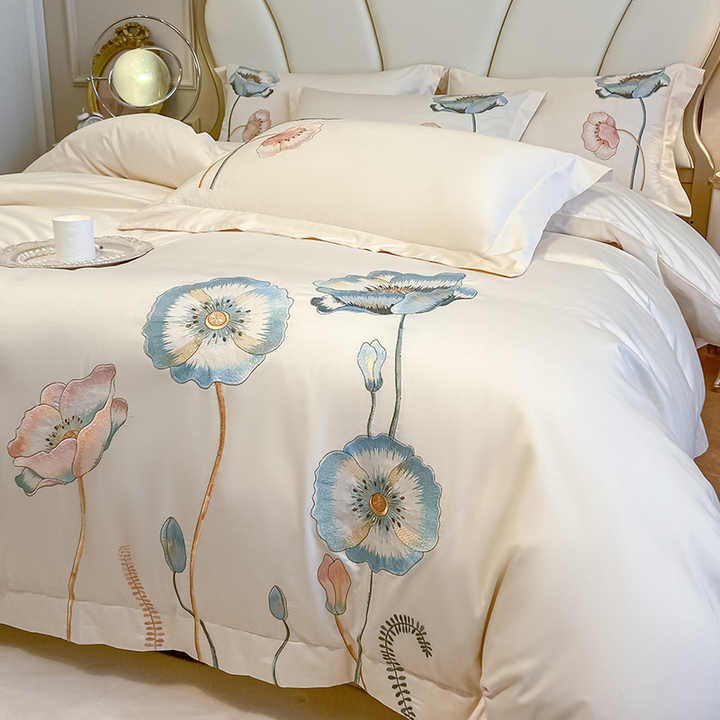 غطاء لحاف مسطحة ملائمة وسادة بيج قطن أنيق مطرز بالأزهار