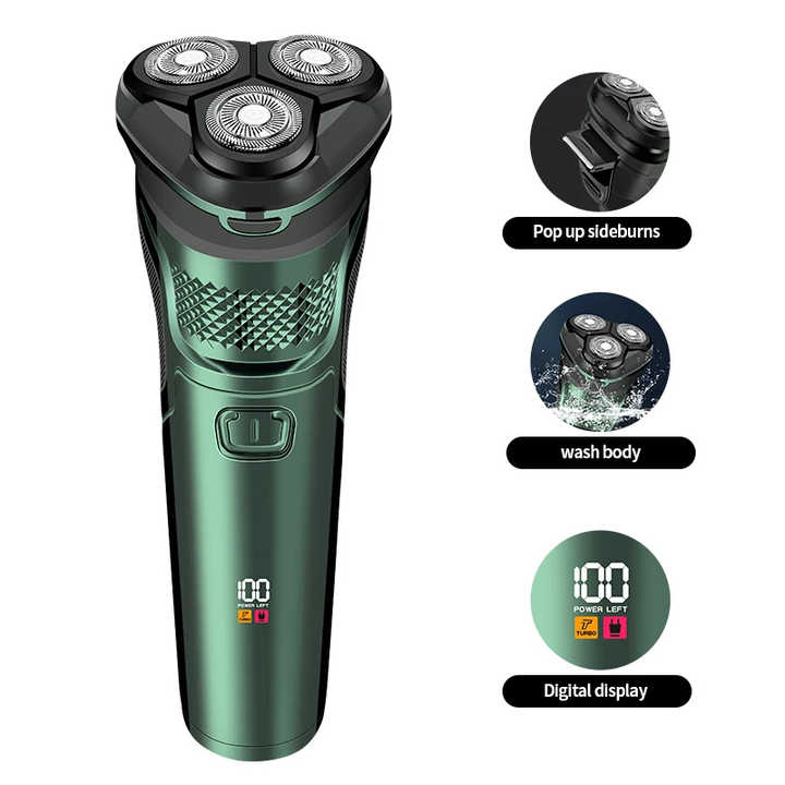 ماكينة حلاقة كهربائية وغسلها LCD ببطارية قوية ثلاثية الرؤوس بشحن USB مقاومة للماء لاسلكية للرجال