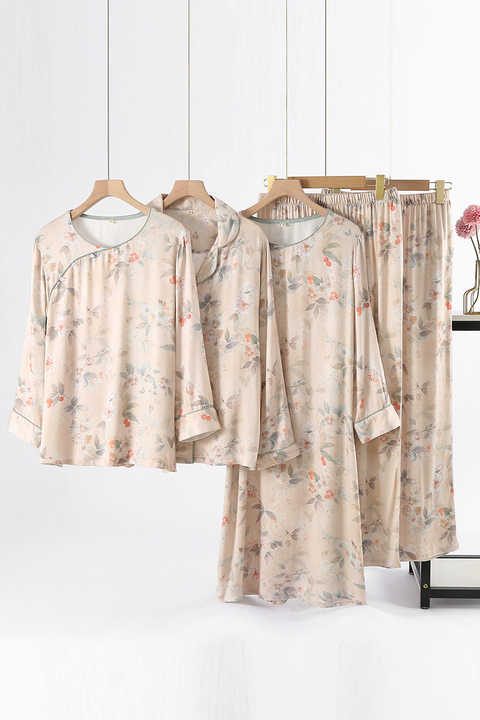 مجموعات بيجامة قطنية مريحة للخريف والصيف عينات مجانية ناعمة جيدة التهوية مع إغلاق برباط طباعة ناعمة منقوشة ليلية