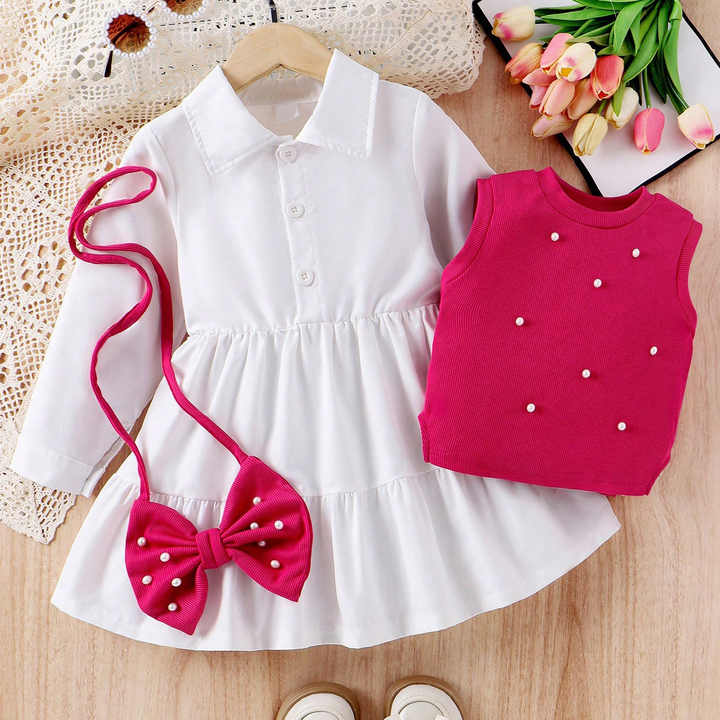 فستان خريفي أبيض نقي بأكمام طويلة + صدرية مطرزة + حقيبة إكسسوارات بفيونكة طقم 3 قطع بدلة 4-7 سنوات للفتيات فستان قميص للفتيات