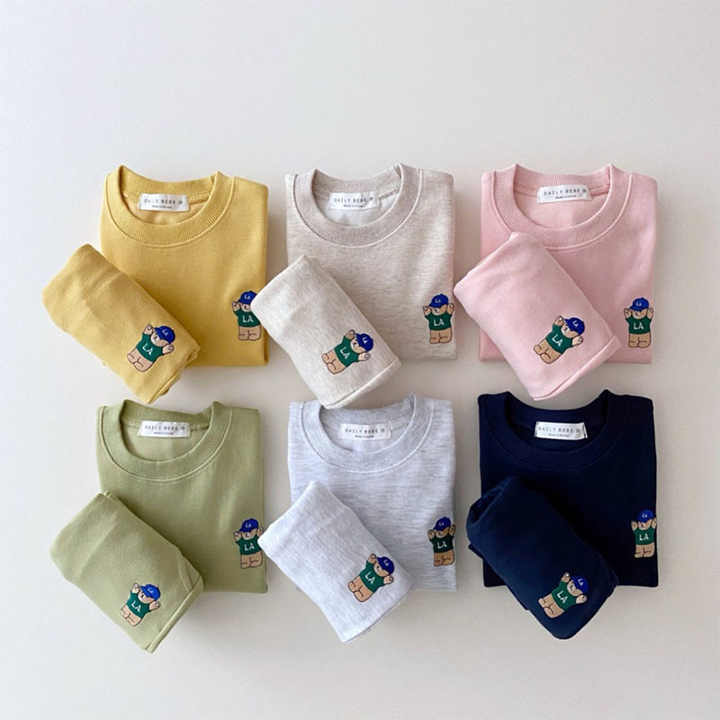 ملابس رياضية خارجية بأكمام طويلة للأولاد والبنات للبيع بالجملة، ملابس رياضية للأولاد والبنات، تي شيرت مطرز بدب للأطفال