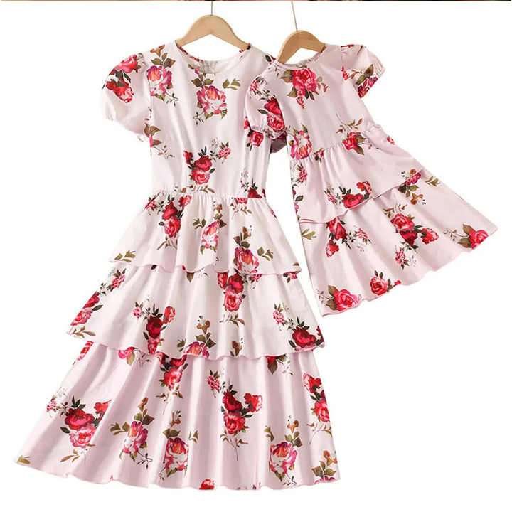 ملابس صيفية جديدة للأطفال والأم برقبة دائرية وأكمام قصيرة مموجة كبيرة فستان أميرات كاجوال ملابس متطابقة للأم والابنة
