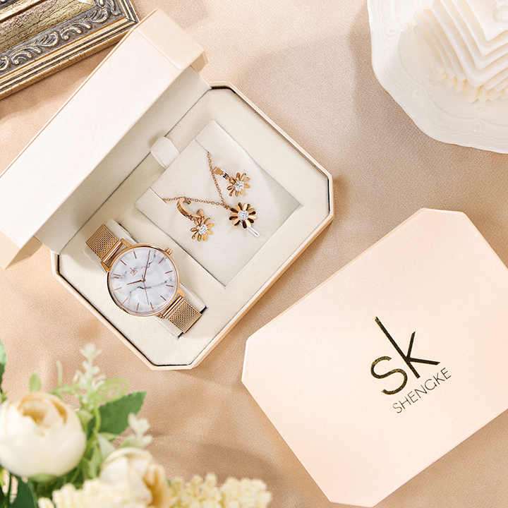 Shengke Luxury Crystal Earrings Necklace Watch Set for Women Girl Clock Reloj Mujer 2023 SK Ladies Quartz Watch Gifts for Women