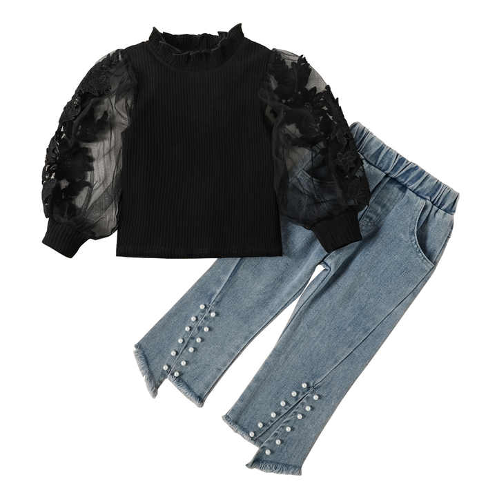 ملابس أطفال جديدة على الطراز الأجنبي ملابس بناتي ربيعية أنيقة بلوزات دانتيل وجينز ملابس بناتي صغيرات