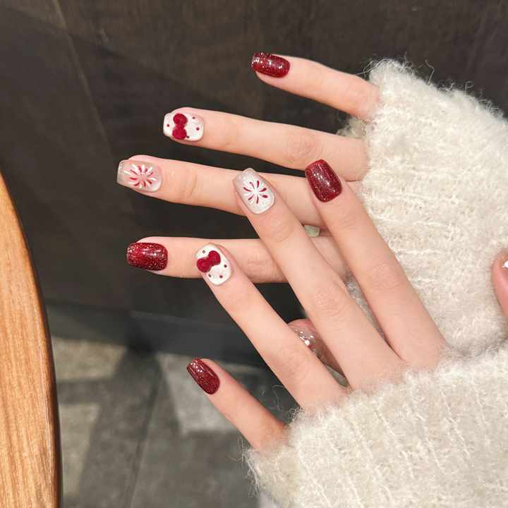 تصميم رسوم متحركة لطيف للعام الجديد على الطراز الصيني، أظافر صناعية فاخرة حمراء قصيرة مصنوعة يدويًا