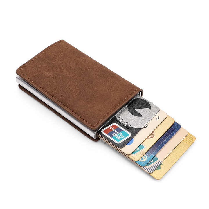 Pop Up PU Leather Metal Wallet RFID Blocking Automatic Credit Aluminum Magnet Card Holder Locker