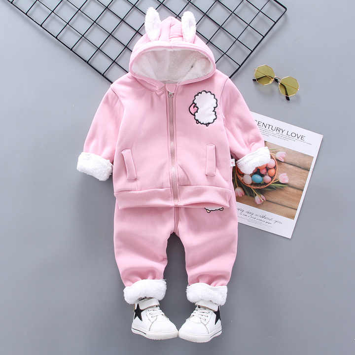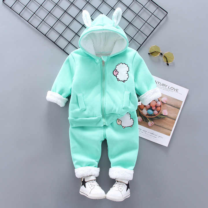 Wholesale autumn and winter children's casual padded clothing two-piece suits thick fleece-lined hooded suit