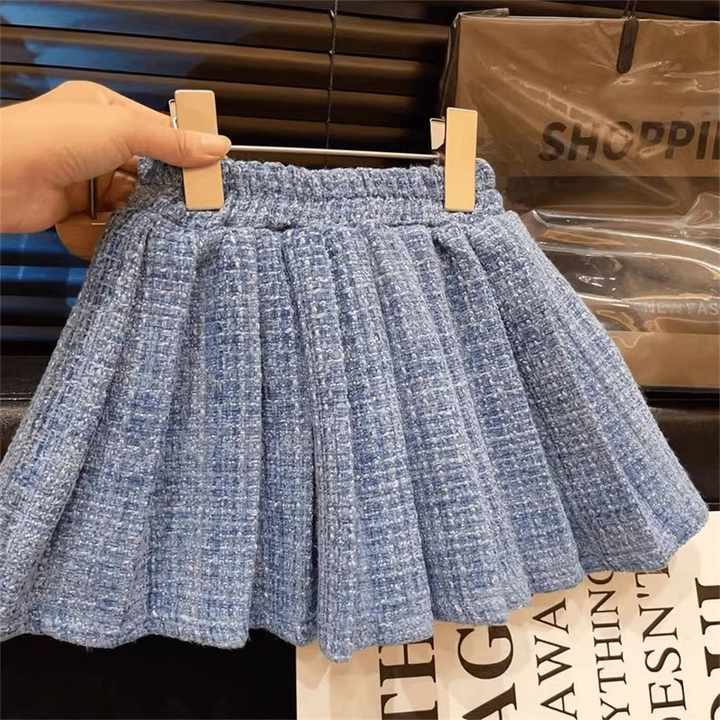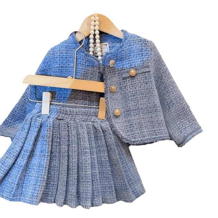 Elegant and graceful children's suit, children's clothing set for girls, blue coat + pleated skirt in the same color