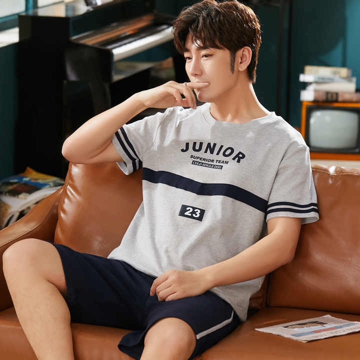 Men's Plus Size Pajamas, Men's Casual Cotton Pajama Sets, Summer Short Sleeve Pajamas + Elastic Striped Shorts, Home Suit, Pajamas