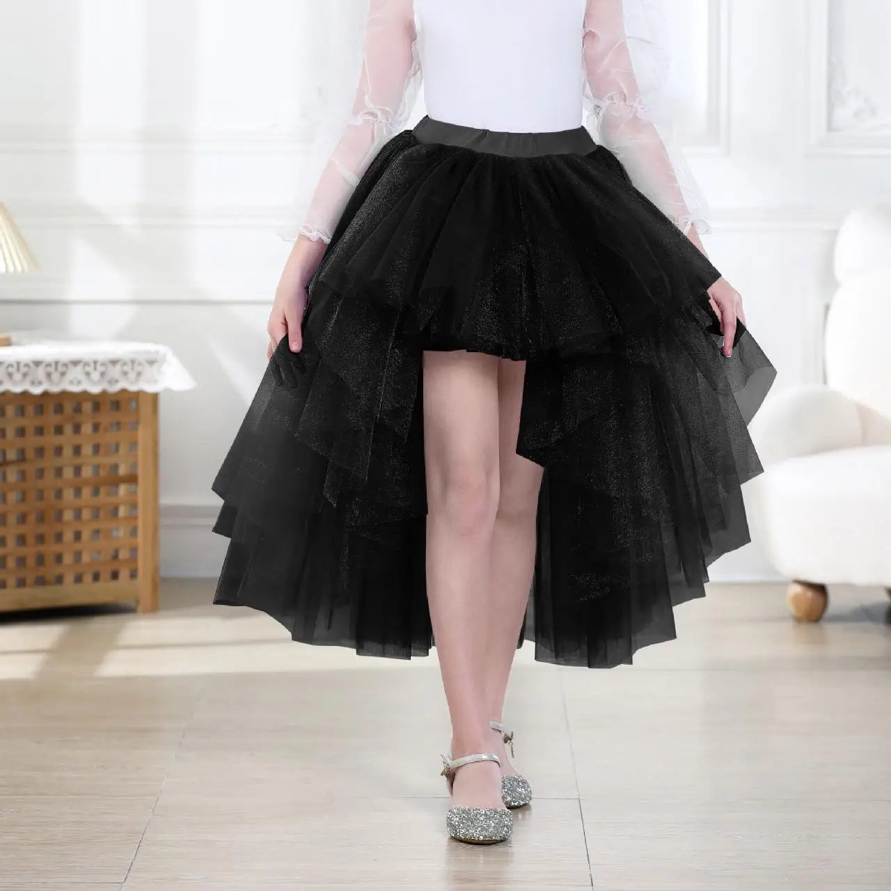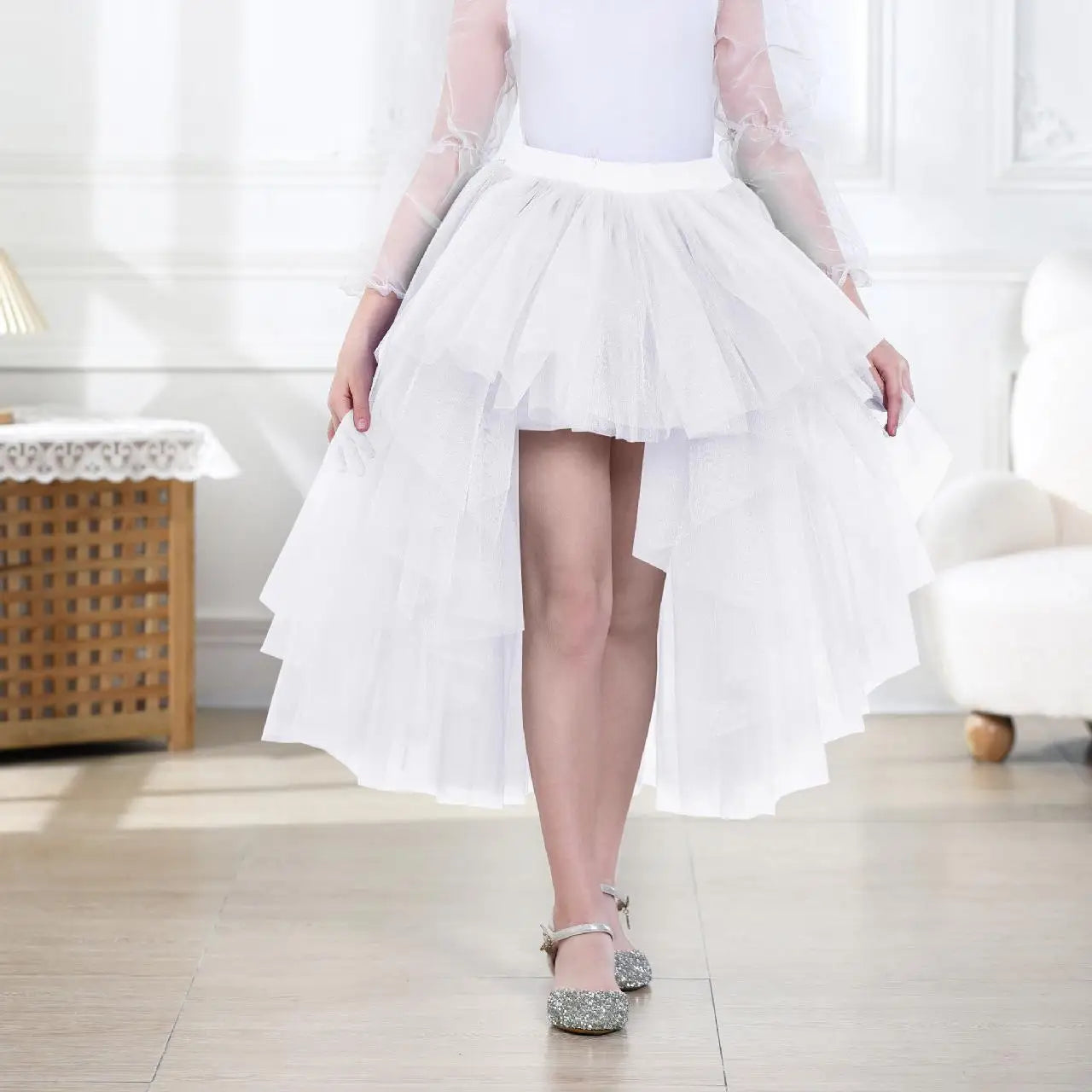 5-12y تنورة خفيفة متدفقة للبنات رائعة من الحرير سهرة فستان حفلات أداء فستان تنورة شبكية غير متماثلة