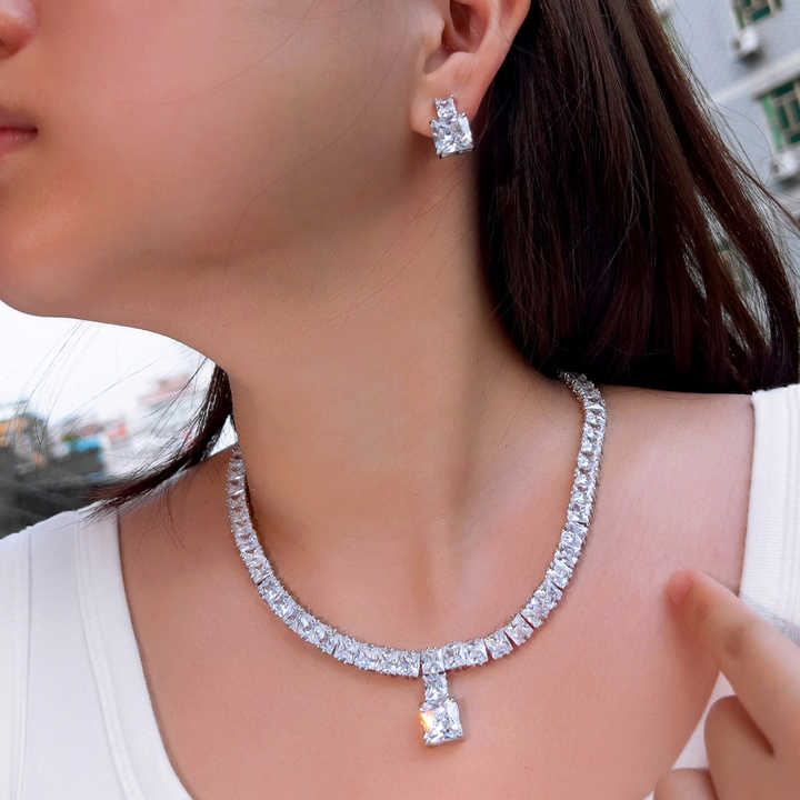 Very Elegant Shiny Square White Cubic Zirconia Wedding Bridal Jewelry Set Necklace and Earrings for Women