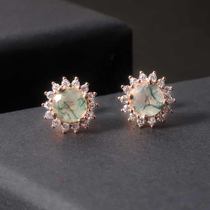 C7199 Abiding Modern Design Cz Halo Moss Agate Real Gold Jewelry 18K Au 750 Flower Women Stud Earrings