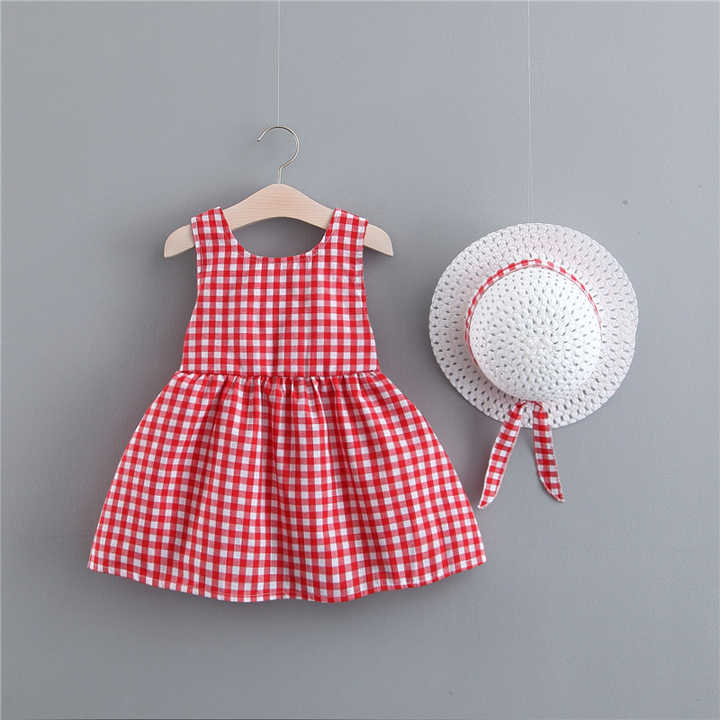 Baby Girl Dress Print Plaid Bow Summer Princess Party Dress Infant Toddler Clothes Newborn Baby Dress+Hat 2pcs Kids Clothing Set