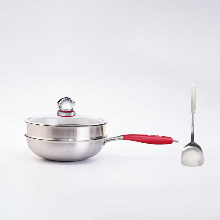 Hullfire 12-Inch Cookware Set Pure Titanium Wok Micro-Pressure Glass Lid Durable Deep Cookware Includes Steamer Basket Spatula