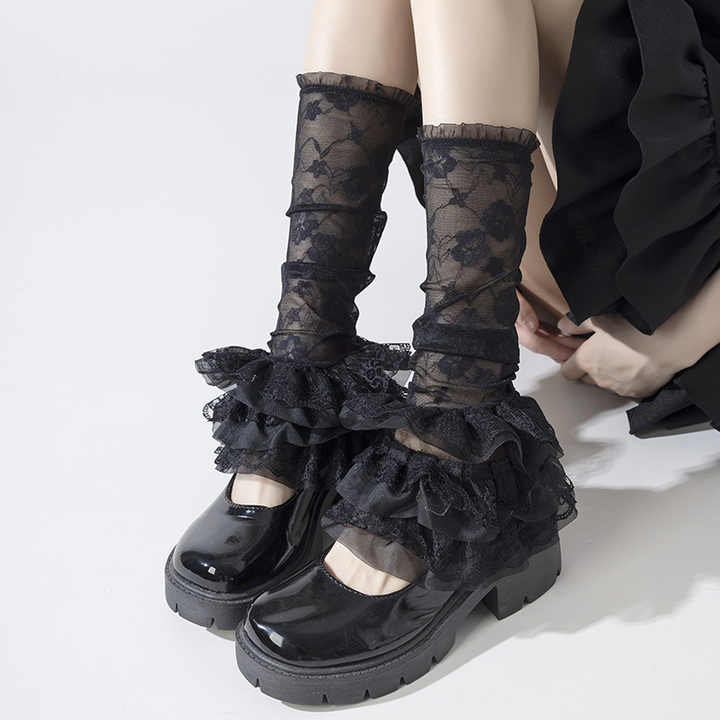 Black White Thin Lace Ruffle Crew Socks Women JK Lolita Knee High Socks